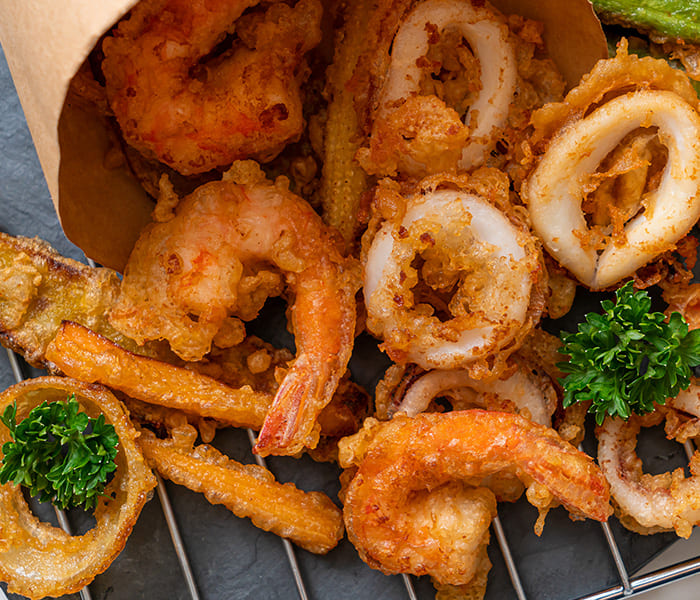 Chicken Tenders, Mozzarella Sticks, Chicken Wings, Onion Rings, French Fries, Cheesy Garlic Bread, Mediterranean Fried Shrimps